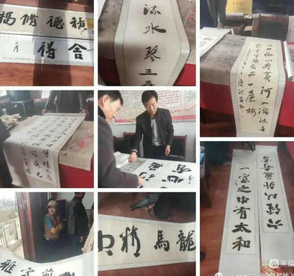 刘红亮、付福运和安康三位老师从上午一直全神贯注地写到傍晚。除了中午吃饭稍作休息,再从没顾上歇一小会儿,虽然已站得疲惫不堪,快写不动了,但他们仍热情高涨地坚持着。对村民们提出的写作内容,书画家们有求必应,热情满足着每一个人的心愿。尤其是他们还给大家写了许多字数颇多、内容丰富的诗文,如《沁园春.雪》、《陋室铭》等。用心、用情、用功的老师们真正走进了群众生活,文化真正实现了“到人民中去”的初衷。