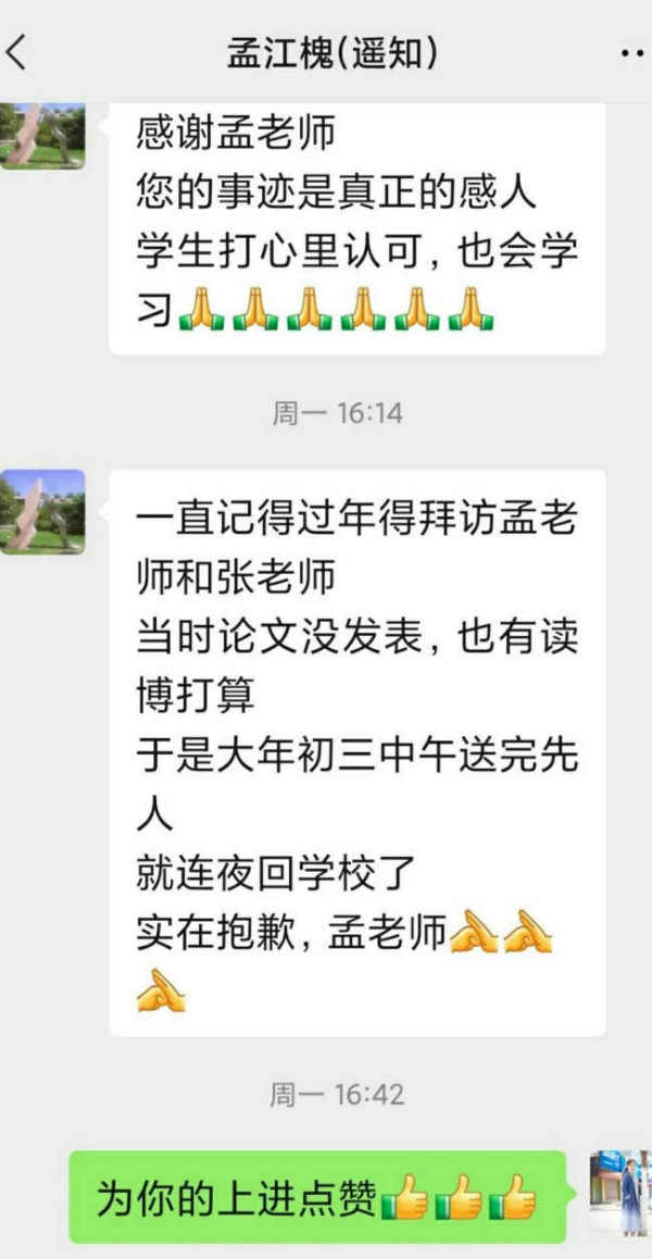 2023年正月十六又一次收到学生孟江槐的祝福,我再次感动不已。江槐, 谢谢你多年来一向的友好和热情,你毕业后多少次的问候、祝福和看望让我感动不已!当重新翻看你寄给我的那真诚无比的信时,当反复阅读你送给我的那本温暖无比的书时,当一再回味你发给我的那些情义无比的短信时,我总会情不自禁地热泪盈眶。这一切更离不开你爸妈良好的教育啊!我孩子若像你一样优秀,我便很知足了。